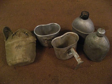 Featured in the picture above, from left to right, is a canteen cover, 1943 dated with a reinforcing strap sewn over the suspension anchor; a rolled lip, M-1910 cup; a flared lip cup; a mid-war canteen with bakelite cap; and an M-1910 canteen with all aluminum construction. Note the different locations of seams on the two canteens.
