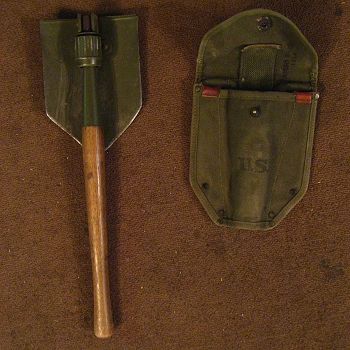 Folding shovels, were an attempt to make entrenching tools compact and non-cumbersom. The design was for a shovel blade attached to a single pole wood handle that had a locking nut. When manipulated, the blade could be hunged from its stowage position to a 90 degree angle to act as a hoe or completely in-line with the handle to act as a shovel.