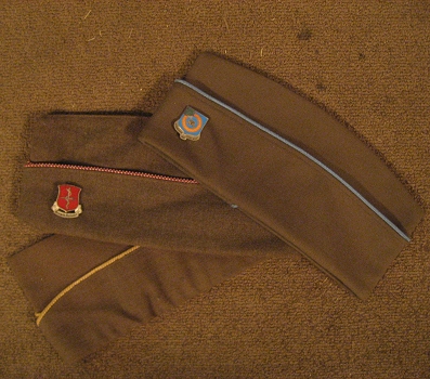 The hat is made of a wool darker in color than the shirt and pants. They are often decorated with a colored braid (officially called the hat cord) running along the sides. The hat cord is signatory of the type of branch that serviceman is a part of and is either one color or has a second color "piped" in to it. Some of the common braids for 2nd Armored are: