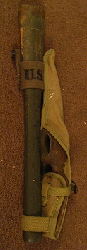 Pick Mattocks, or Pick Axes, were issued to several soldiers in a squad. They were designed with a heavy pick head that slipped in to a handle. They were good for breaking up hard ground for shovels to dig. The cover, usually khaki (for earlier war), OD #3 or OD #7, had hooks in which the item could be harnessed on to a belt or a pack.