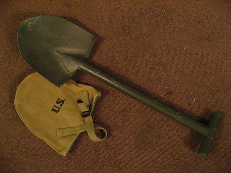 The U.S. Army decided to reuse the effective shovel it issued in the Great War. The design was sturdy and rugged and lacked any moving parts for soldiers to break. They were made of a single shaft of wood ending in a wooden "T" handle. The shovel blade was metal, with a stamped "US" usually in the neck. The entire shovel was painted a dark OD green. The accompanying carrier was the lighter OD #3 canvas with a buckle strap that wrapped around the neck of the shovel. A black ink "US" was stamped in to the top. The cover could be hooked in to eyelets on the haversack, situating it underneath the meat can pouch, or on to the cartridge or pistol belt itself.
