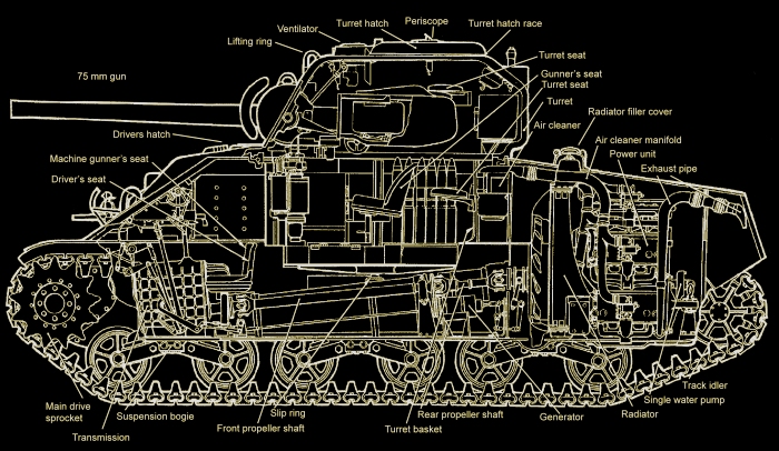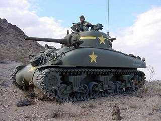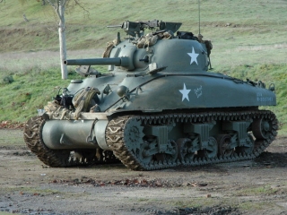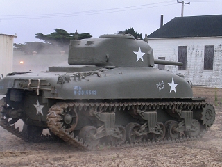 The Sherman is a complex piece of machinery, however it's relatively simple in maintenance when compared to the more technical designs of the German tanks. Thus, Shermans were easily produced. Further, the overall design was implemented in a wide range of variants and platforms. The tank crewed five members: a driver, an assistant driver/bow machine gunner, tank commander, gunner, and loader. We typically crew four as we don't have a need for a loader. The gun is a propane charge gun which provides a loud bang with a nice flash. The machine guns are working M1919s fixed to shoot semi-auto or can be removed to accommodate fully-auto M1919s supplied by qualified weapons handlers during movie and TV shoots.