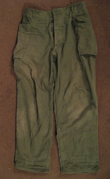 Once again, one must take note of the difference in Army to Marine patterns. They had diagonal cut pockets (much like regular pants, except that the pant leg material served as the pocket lining), and two open cut pockets in the rear. The Marine choice of Sage Green (a lighter green) should also be noted as well as the US Marine style buttons.
