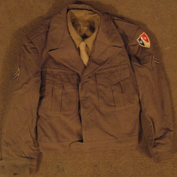 The Ike Jacket became standardized for issue in mid-1944. Later that year, the Service Coat became superceded by the Ike and fell to a limited standard. The jacket was intended for dual purpose. It was designed to be worn under the M43 jacket, serving as a second liner. The coat was also designed big to accomodate layering underneath, such as sweatshirts and the wool shirt. However, because troops issued the new Ike weren't issued a Service Coat, the new jacket proved to be to big when used alone as a dress uniform. As a result, many soldiers went and had their Ike jackets fitted so that they were snug... effectively reducing their intended field purpose.