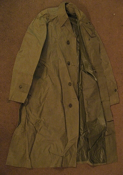 For waterproofing their soldiers, the Army in 1938 issued out a rubberized fabric coat. It had no hood - just a collar - and buttoned up in the front. The coat also had two slash pockets which opened in to the jacket to allow access to the uniform underneath. It was not very popular with the troops. Later in the war, a synthetic fabric raincoat became the standard issue.